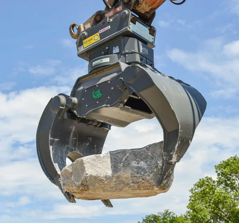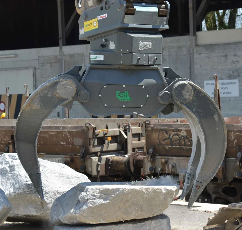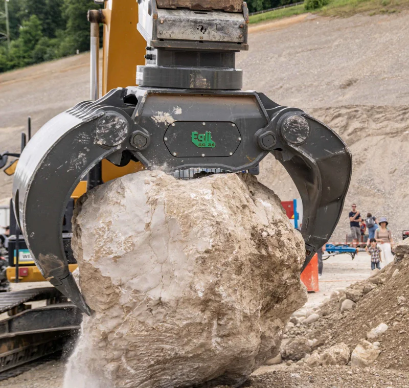 Der Egli Steingreifer eignet sich optimal zum Versetzen von Findlingen und Sichtsteinen. Zusätzlich wird er gerne für das Erstellen von Steinmauern, Flussverbauungen oder den Verlad von Steinen z.B. auf Nutzfahrzeuge eingesetzt.