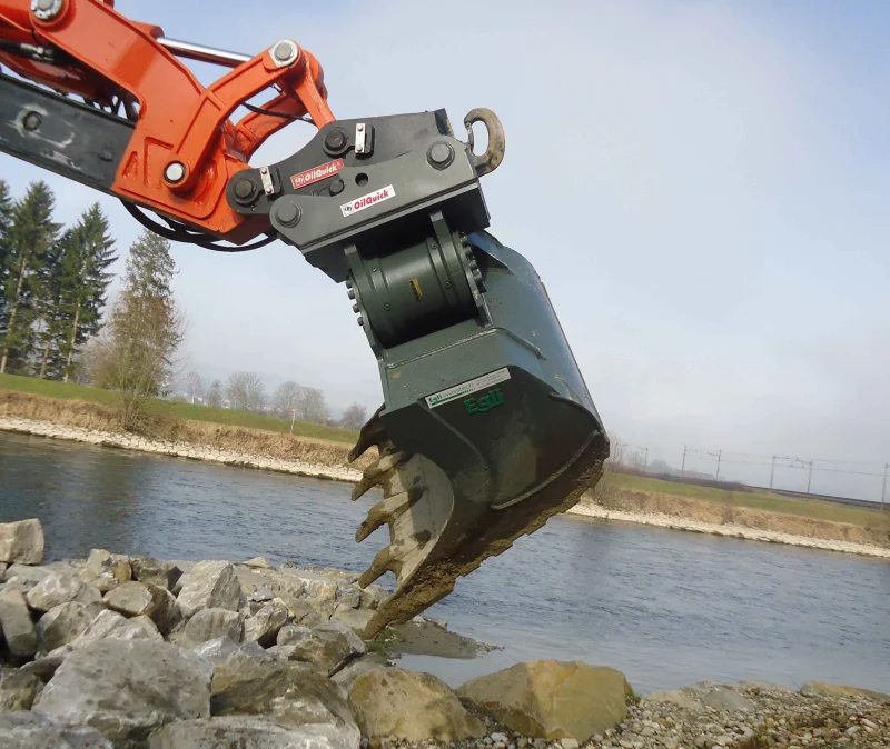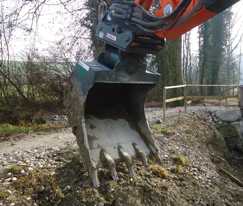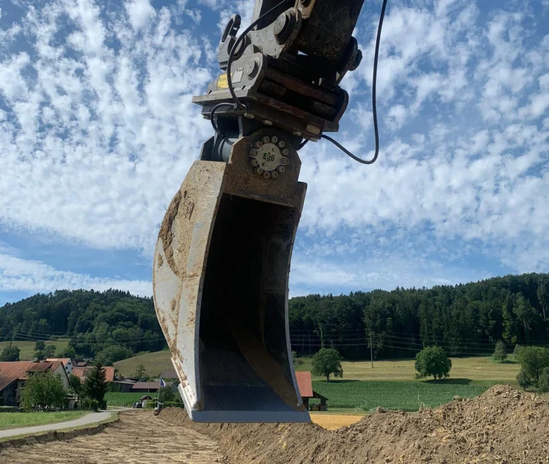Der Egli Schwenktieflöffel ist ein Tieflöffel, der mittel eines Drehmotors beidseitig um 50˚ geschwenkt werden kann.