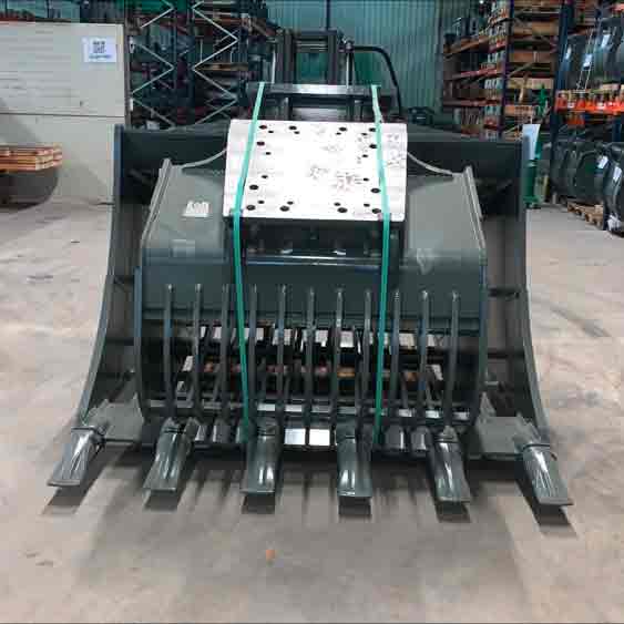 Der Sieblöffel hat anstelle eines gebogenen Bodenblechs, längs angeordnete Rechteckstege mit einem wählbaren Abstand zur Bestimmung der gewünschten Korngrösse. Durch diese spezielle Bauform ist der Löffel ein super Werkzeug zum Sortieren von Grob- und Feinmaterial, wahlweise mit Zähnen oder Messer erhältlich.
