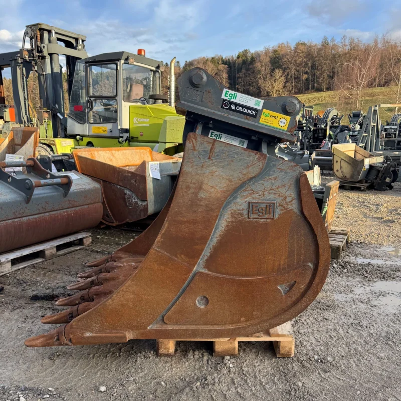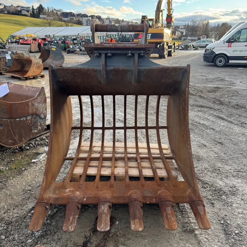 Der Sieblöffel hat anstelle eines gebogenen Bodenblechs, längs angeordnete Rechteckstege mit einem wählbaren Abstand zur Bestimmung der gewünschten Korngrösse. Durch diese spezielle Bauform ist der Löffel ein super Werkzeug zum Sortieren von Grob- und Feinmaterial, wahlweise mit Zähnen oder Messer erhältlich.