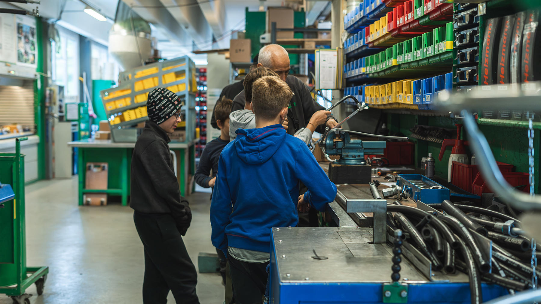 Aufgeteilt in drei Gruppen ging es weiter. Die Schüler:innen konnten den Elektroposten, den Schlauchposten und den Hydraulikposten besuchen. Dort durften sie unter anderem einen Schlauch pressen und ein Röhrchen biegen.