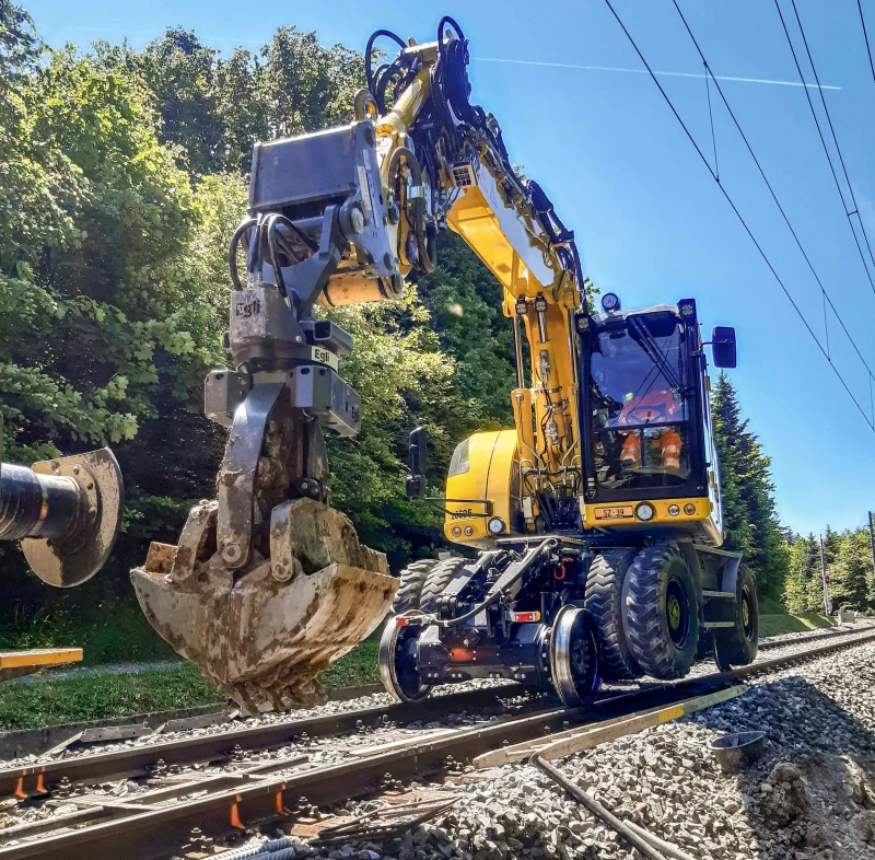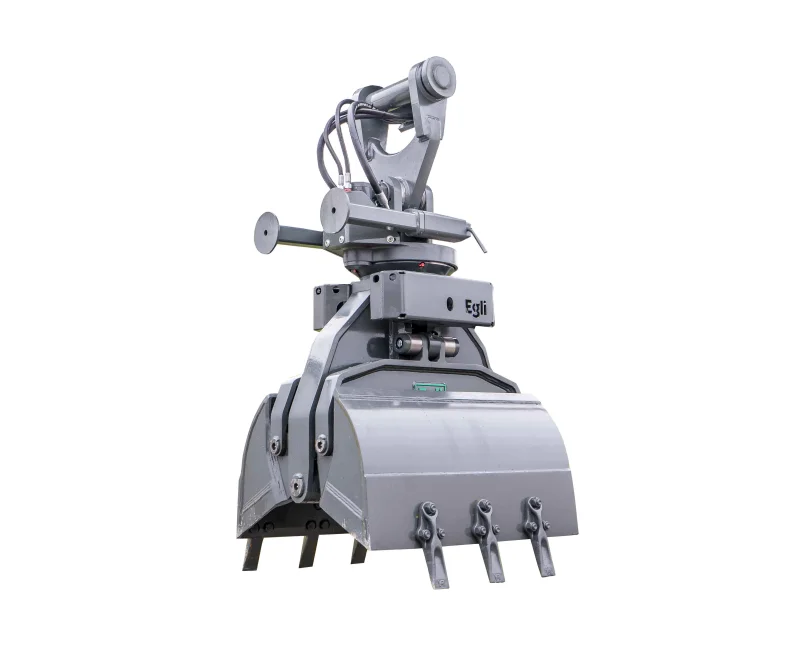 The Egli mast foundation grapple has a solid, centralised hydraulic cylinder that can be operated at up to 350 bar. The mast foundation grapple is primarily used in track construction.