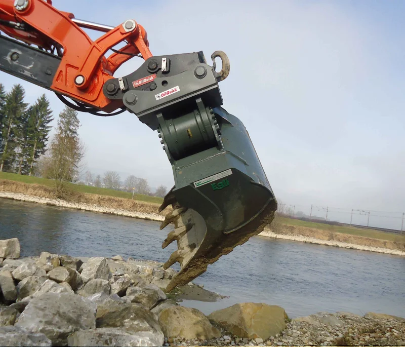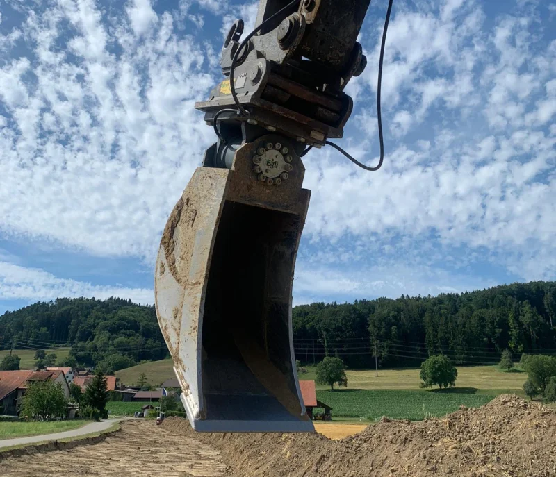 The Egli swivelling bucket is a backhoe bucket that can be swivelled by 50˚ on both sides using a rotary motor.