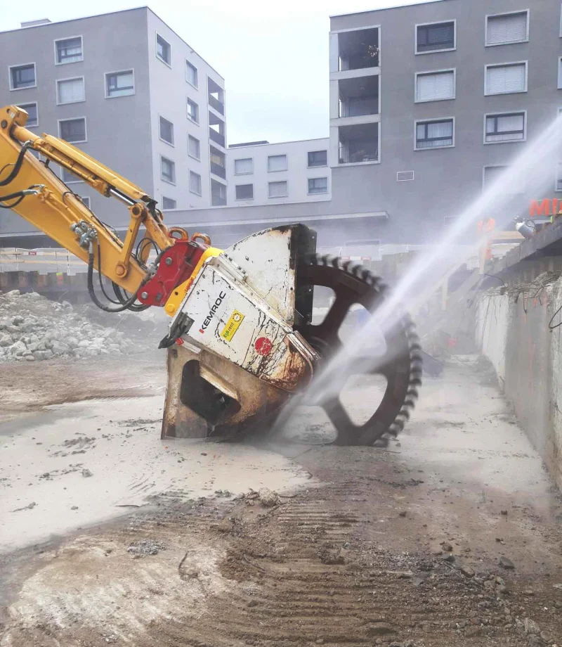 The cutting wheel with dual motor for rocks up to 120 MPa guarantees high drive power and maximum cutting forces. The cutting wheel can be used up to 30 m under water, making it ideal for sewer work or underwater concrete demolition.
