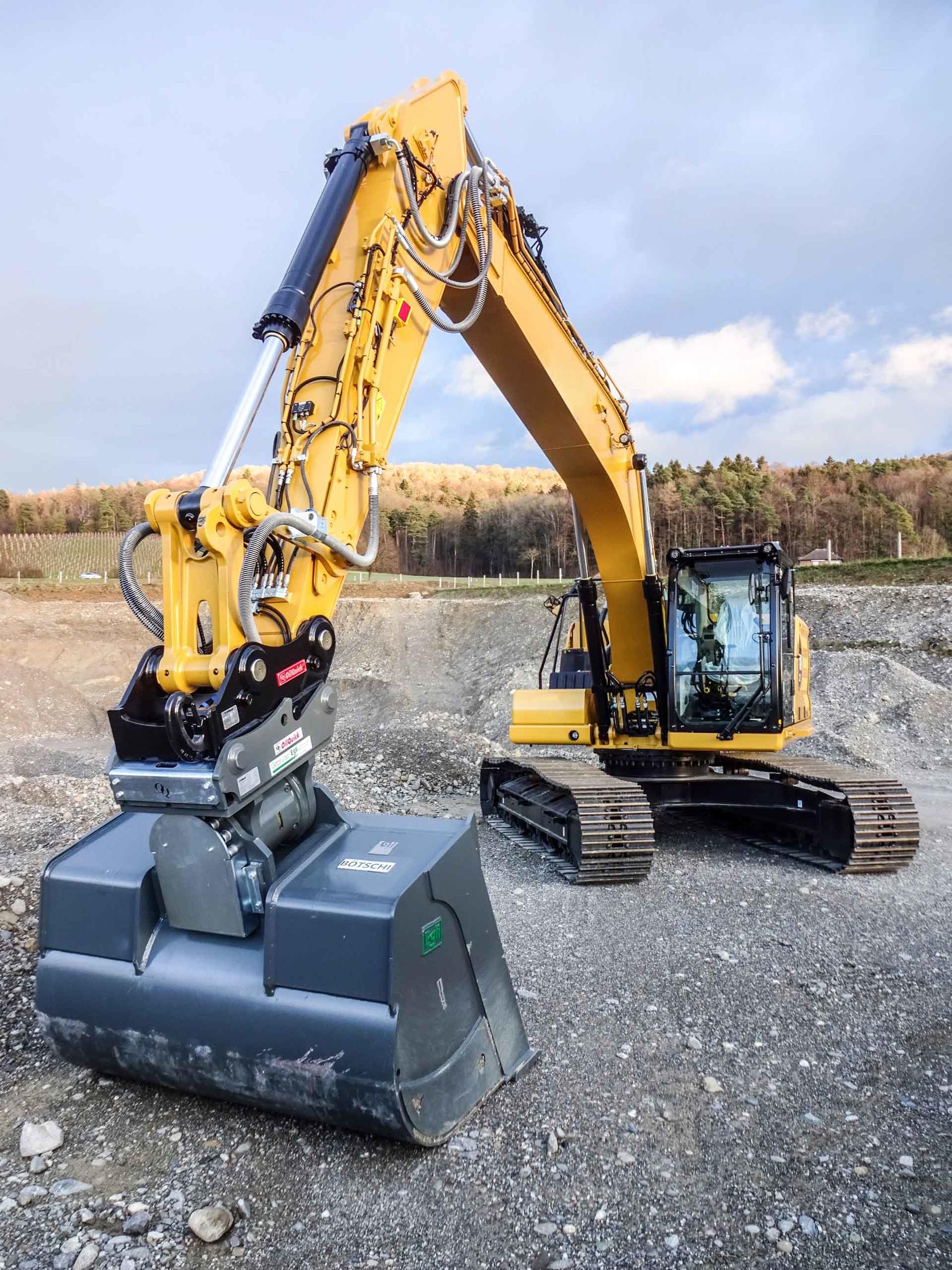 The swivelling drive is not permanently mounted on the excavator stick. Attachments can be swivelled and, depending on the version, can also be operated hydraulically.