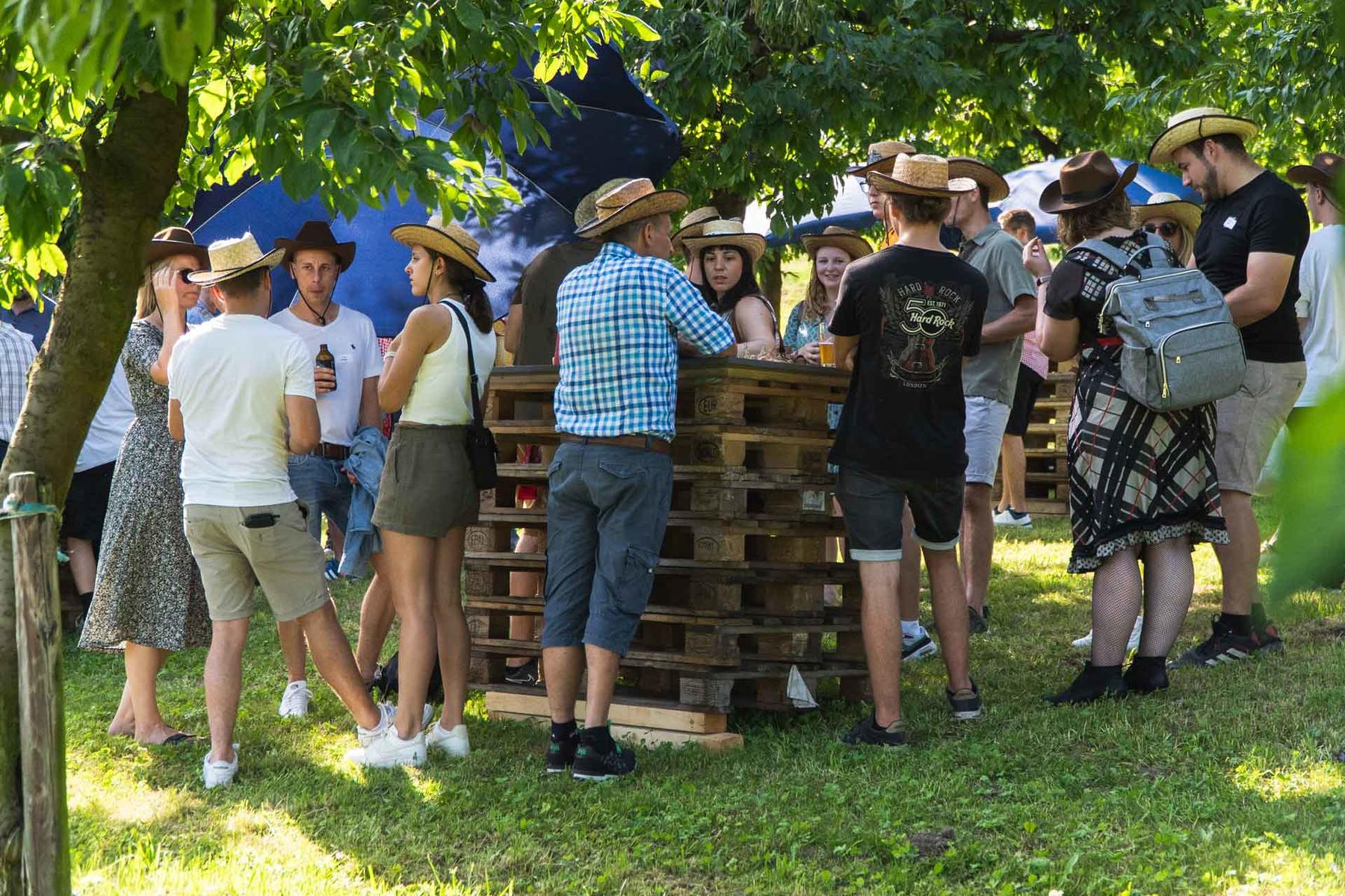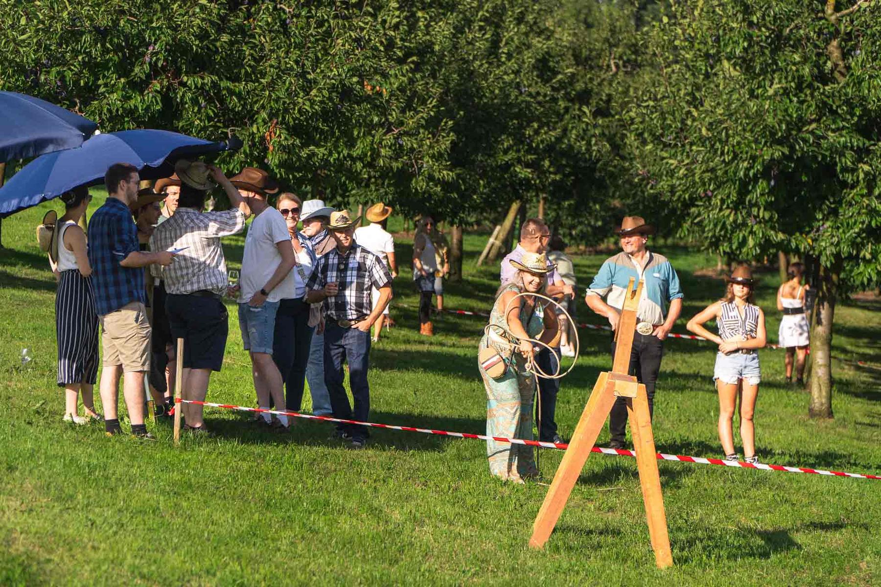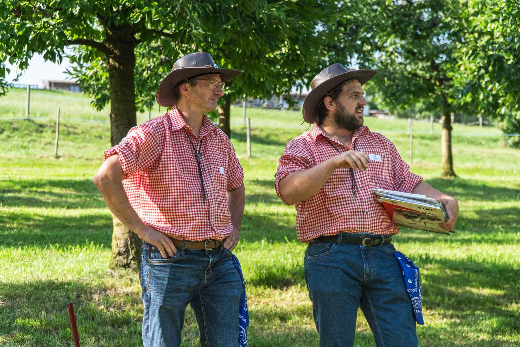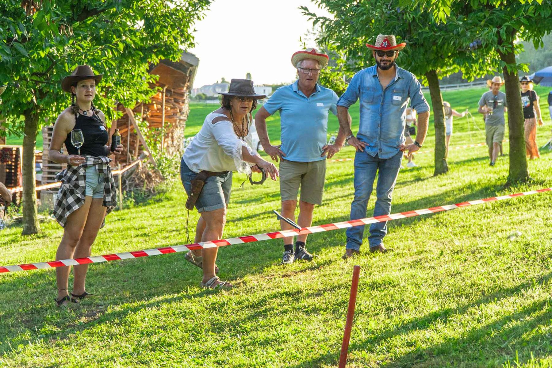 C'est par un magnifique temps d'été que les collaboratrices et les collaborateurs de l'entreprise Egli et leurs partenaires se sont retrouvés à Rossrüti pour marcher ensemble jusqu'au Feldhof. À leur arrivée, tous ont reçu un chapeau de cow-boy et ont pu se rendre directement à l'apéritif servi à l'ombre des arbres derrière la grange. Après quelques informations d'ordre organisationnel, les cow-girls et les cow-boys ont été répartis en différents groupes selon leurs chapeaux et les jeux ont pu commencer.