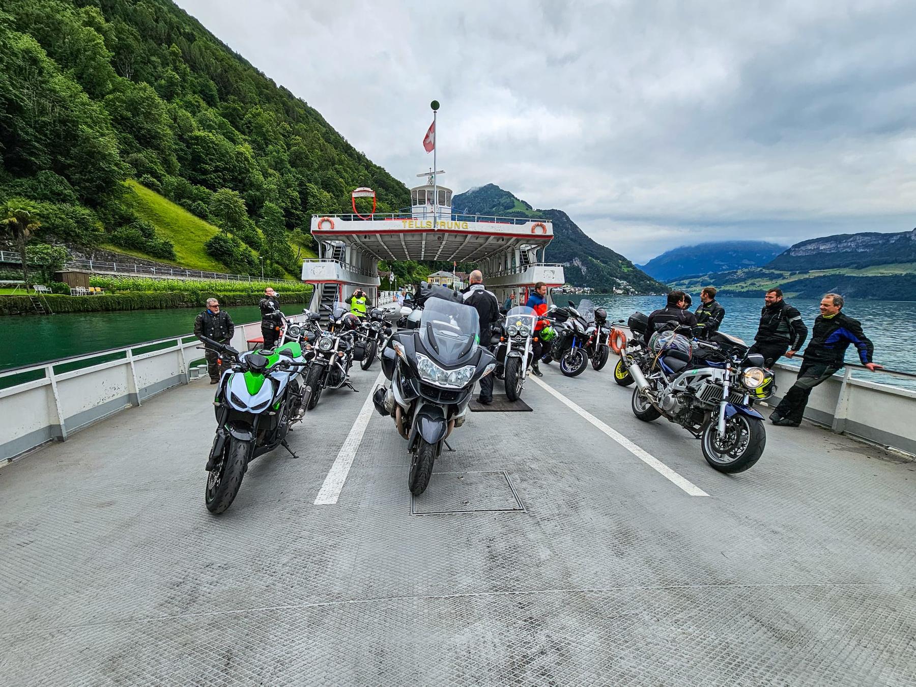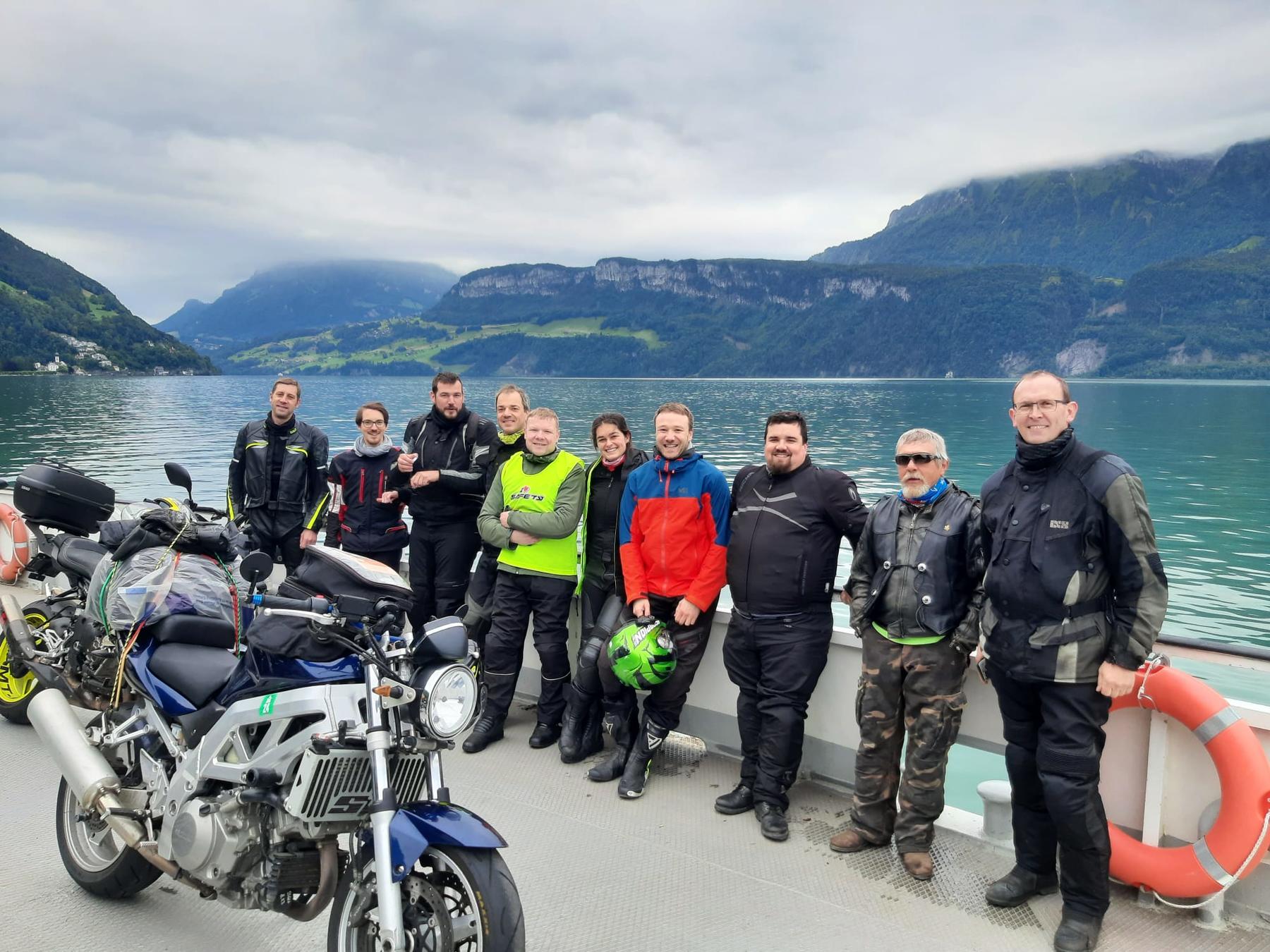À l'heure du repas de midi, nous nous sommes arrêtés au Sattelegg et nous nous sommes réchauffés en dégustant un bon repas. Après avoir mangé, nous avons continué notre tour en direction de la Suisse centrale, où nous avons pris le ferry de Gersau à Beckenried sur le lac des Quatre-Cantons; une bonne occasion pour une première photo de groupe et pour se dégourdir brièvement les jambes.