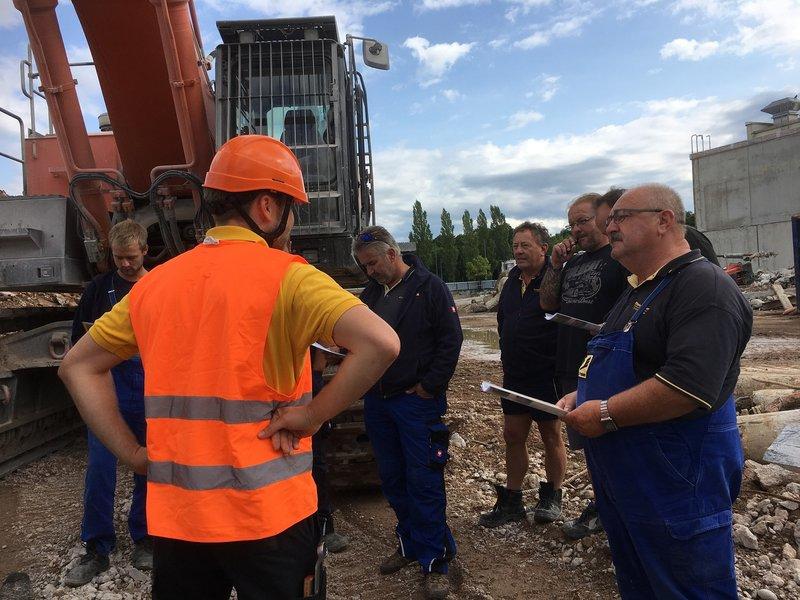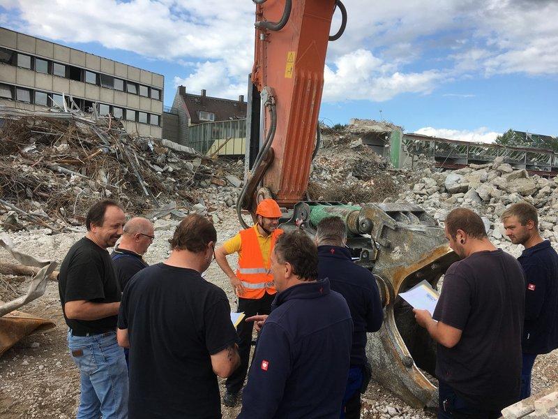 L'instruction des machinistes sur le broyeur à béton XMB 5.4 Egli réunit une belle troupe de machinistes. Durant l'instruction des deux collaborateurs Egli, des questions importantes sur le nouvel engin sont posées: pourquoi la mâchoire en forme de caisson est-elle ronde comme une mâchoire d'animal? Comment fonctionne le changement hydraulique de mâchoire? Qu'avez-vous fait avec la pince de démolition pour qu'elle soit si rapide? Il y a de gros morceaux de béton, peu de fines, un matériau de recyclage idéal, taillé sur mesure pour notre projet. Il est étonnant de constater qu'après seulement une bouchée, le matériau est découpé en petits morceaux et prêt à être concaccé. Un après-midi formidable avec des discussions fascinantes et des questions intéressantes. Un grand merci pour l'organisation de cette séance d'information et pour l'intérêt porté à notre pince de démolition très gourmande XMB 5.4 et à sa petite soeur la pince XMB 2.8. Nous vous souhaitons beaucoup de plaisir à mordre!