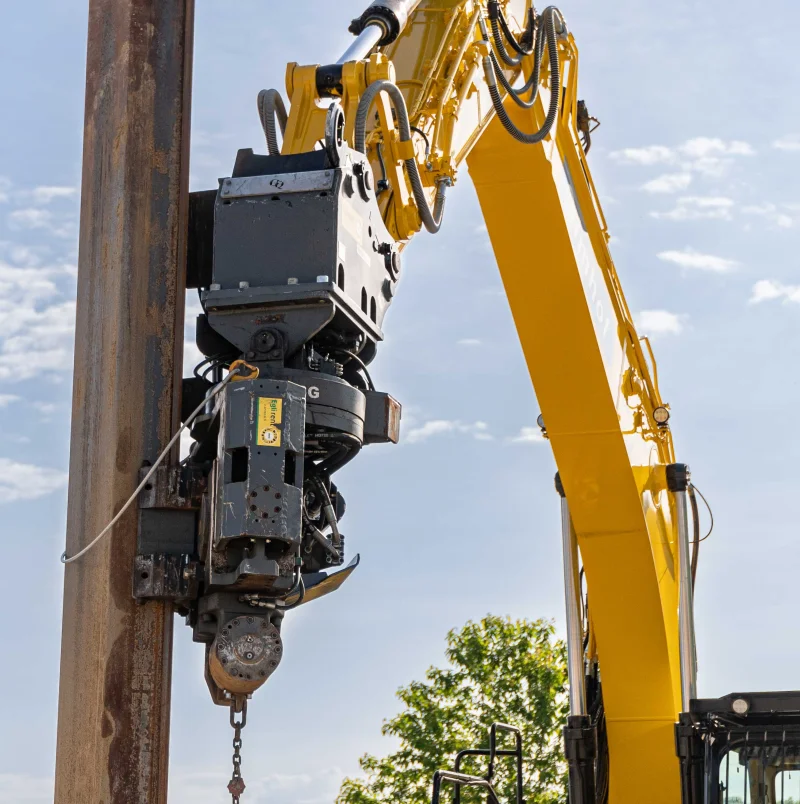 Les vibrofonceurs à prise latérale peuvent ramasser le matériau à enfoncer, l'étendre et l'enfoncer dans le sol par vibration en une seule fois. Avantage décisif lors d'espace de construction ou de hauteur limités, les vibrofonceurs traditionnels montés sur pelle devant se poser par le haut sur le matériau à enfoncer.