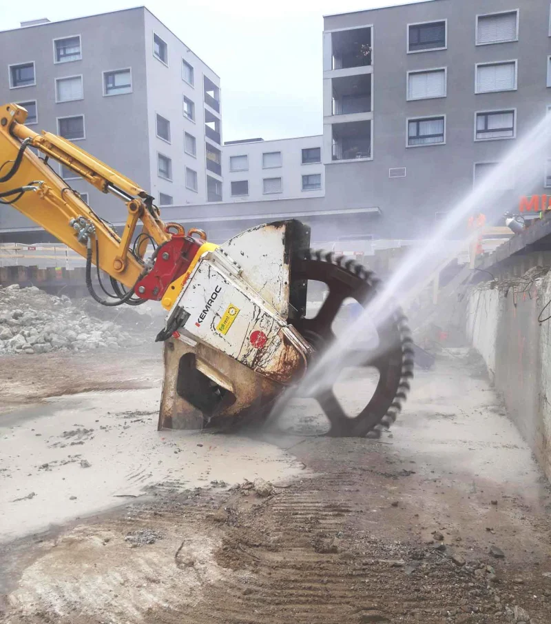 Cette roue de coupe avec double moteur pour les roches jusqu'à 120 MPa garantit une puissance d'entraînement élevée et des forces de coupe maximales. Grâce à sa possibilité d'utilisation jusqu'à 30 m sous l'eau, la roue de coupe est idéale pour les travaux de tranchées ou pour la démolition de béton sous l'eau.