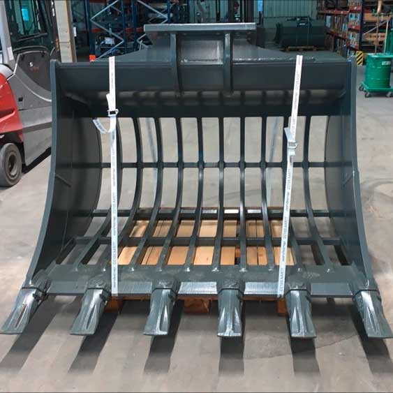 Au lieu d'un fond incurvé, le godet cribleur dispose d'entretoises longitudinales rectangulaires disposées à distance sélectionnable permettant de déterminer la granulométrie souhaitée. La forme spéciale de ce godet en fait un super outil pour le triage de matières grossières et fines, disponible avec dents ou lame.