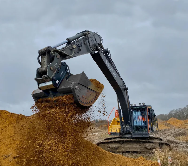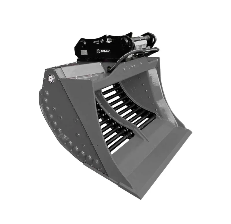 La benna vagliatrice idraulica garantisce un flusso di materiale perfetto durante il processo di vagliatura, grazie a 12 alberi vagliatori attivamente azionati.