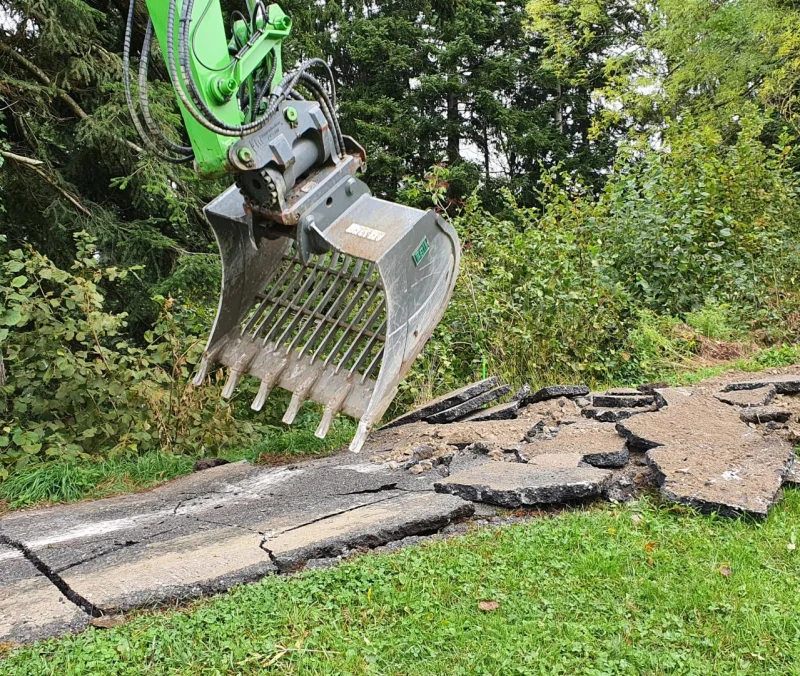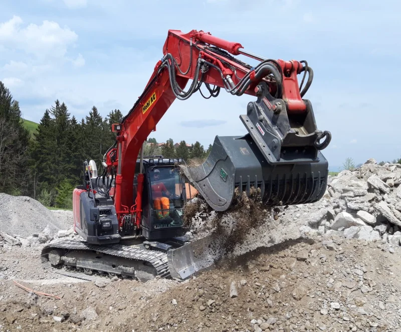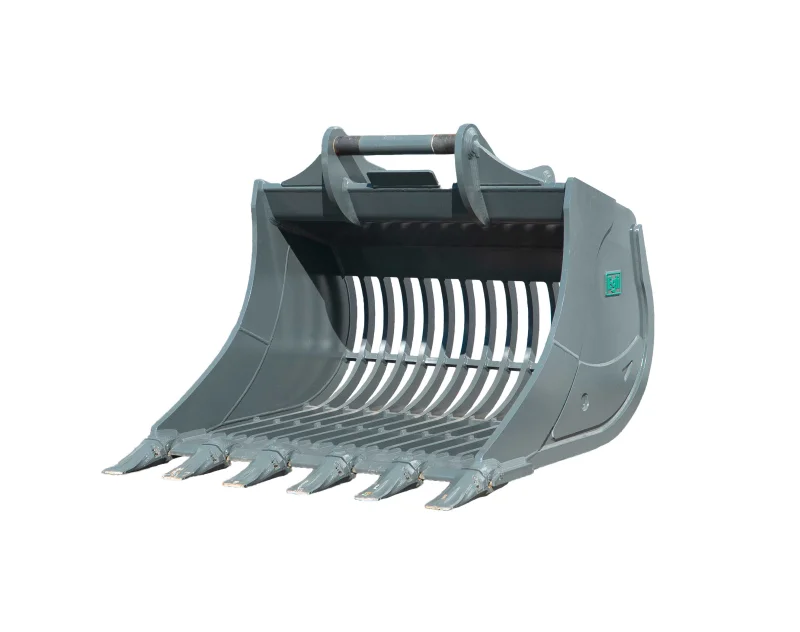 La benna grigliata Egli ha barre rettangolari longitudinali con distanza regolabile per determinare la granulometria desiderata. Questa costruzione la rende ideale per selezionare materiali grossolani e fini ed è disponibile con denti o lama.