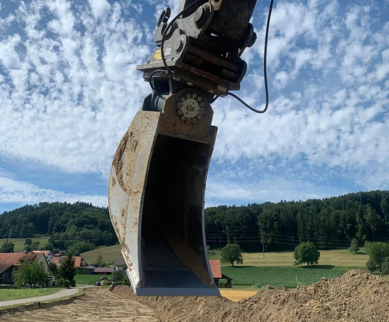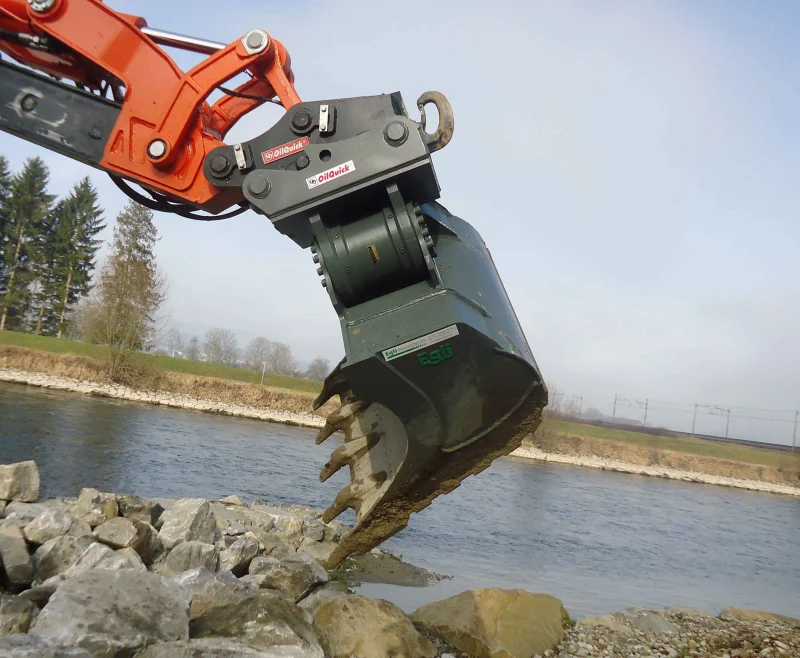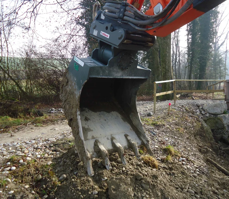 La benna orientabile Egli è una benna da scavo che può essere inclinata su entrambi i lati di 50˚ grazie a un motore rotante.